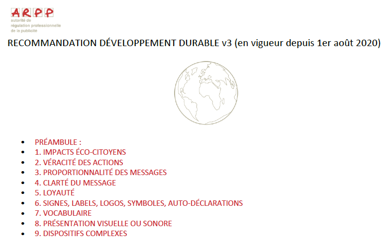 Liste de règles déontologiques de l'ARPP concernant les recommandations sur les allégations en lien avec le développement durable. (ARPP = Autorité de Régulation Professionnelle de la Publicité)